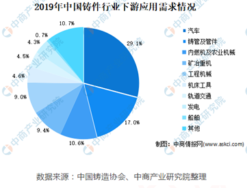 2019年我國鑄件行業(yè)市場需求占比上升的有工程機械、鑄管及管件、軌道交通、礦冶重機,汽車工業(yè)是鑄件市場需求劇透,2019年汽車鑄件占比小幅度下降,為29.1%。農(nóng)業(yè)機械、機床工具、發(fā)電設(shè)備等行業(yè)市場占比都有小幅度下降。